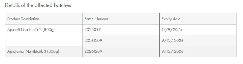In a statement, the commission warned consumers about the recall of two products manufactured by Nutricia: Aptamil Nutribiotik 2 (800g) and Aptajunior Nutribiotik 3 (800g).