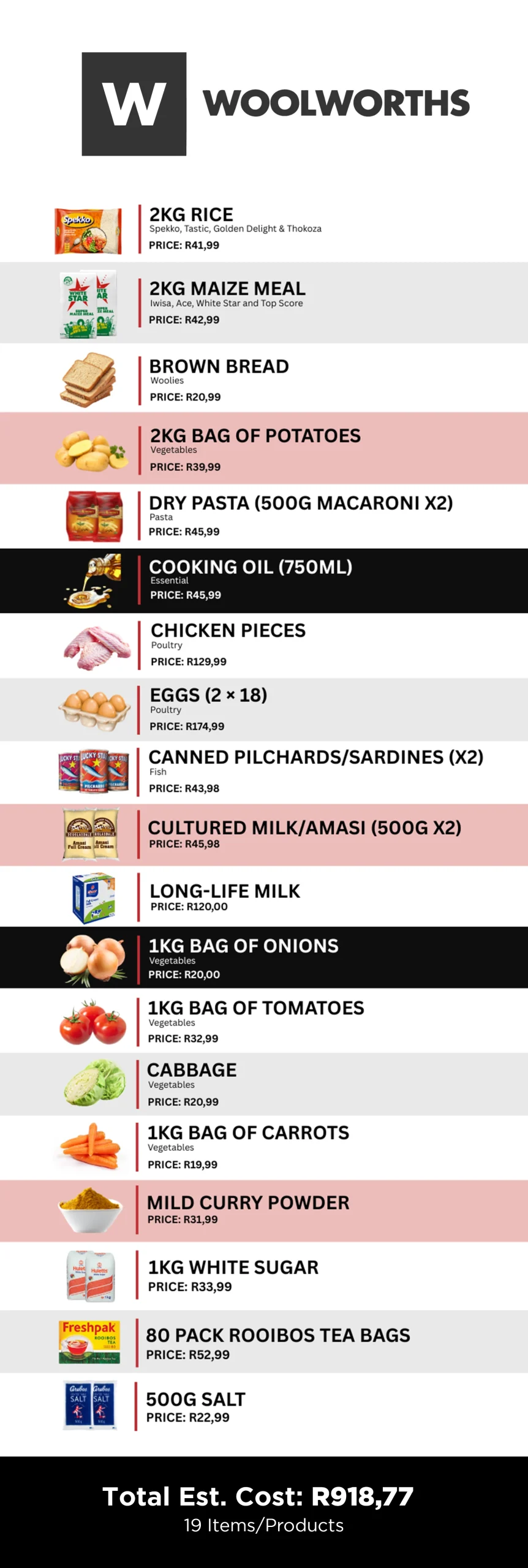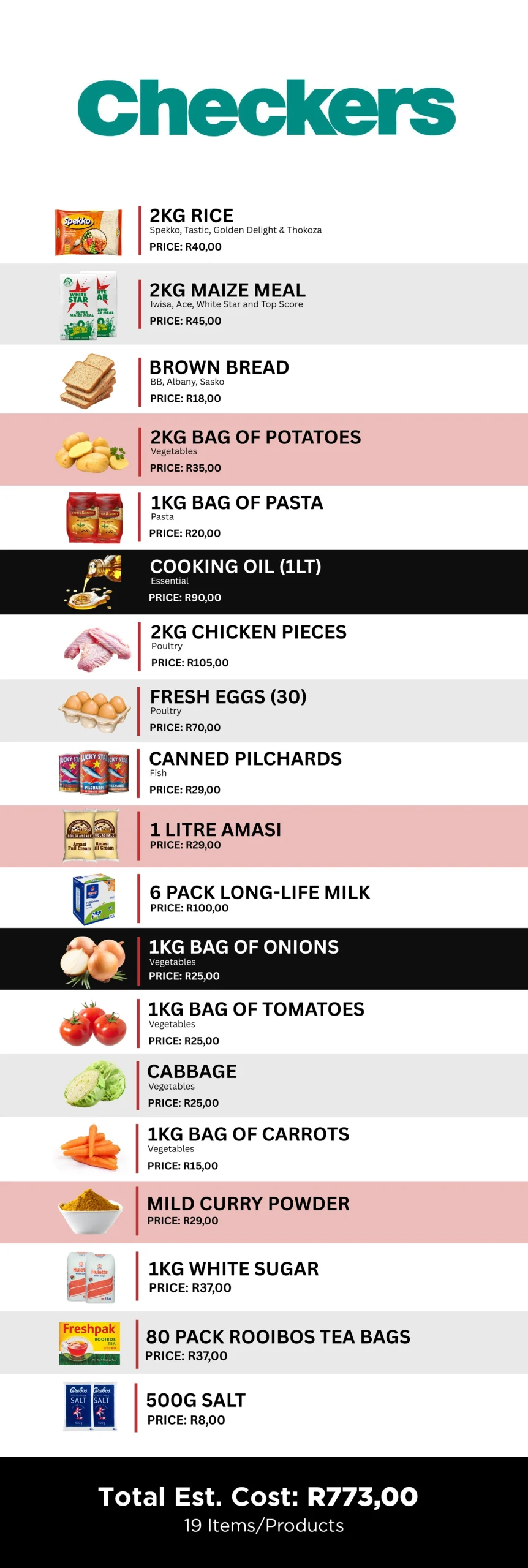 Below is a breakdown of household food baskets from Checkers, Pick’n Pay, and Woolworths.