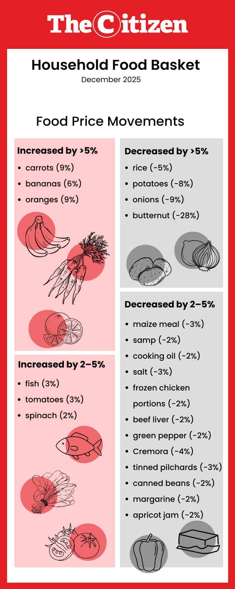 Food items in the household food basket that cost more than 5% more in December compared to November, include carrots (9%), bananas (6%) and oranges (9%).