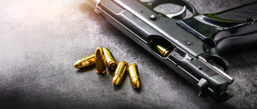 Hand gun with ammunition on dark stone background. 9 mm pistol gun military weapon and pile of bullets at the metal table.