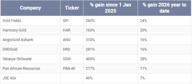 These outsized gains in precious metals stocks have pushed the JSE Alsi up 46% since the beginning of 2025, with the trend continuing into 2026.