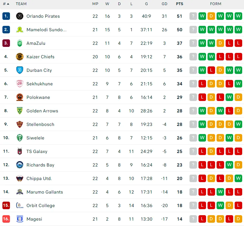 At the time of publishing, the Buccaneers are 15 points ahead of Amakhosi. However, the Glamour Boys have played two fewer matches.