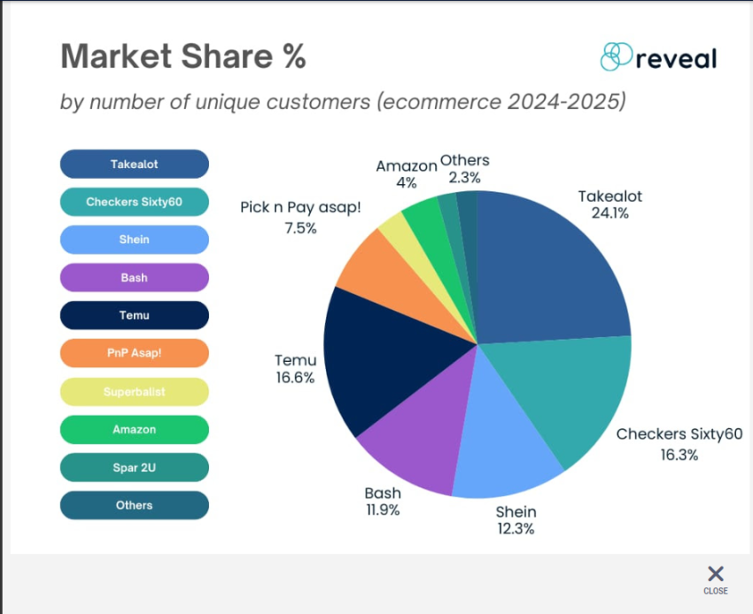Reveal has Takealot’s share at 24% and TFG’s Bash at 12%.