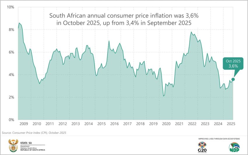 According to Statistics SA, annual consumer inflation increased to 3.6% in October from 3.4% in September. This is the highest inflation print since September 2024, when the inflation rate was 3.8%. The consumer price index (CPI) increased by 0.1% month-on-month in October 2025.