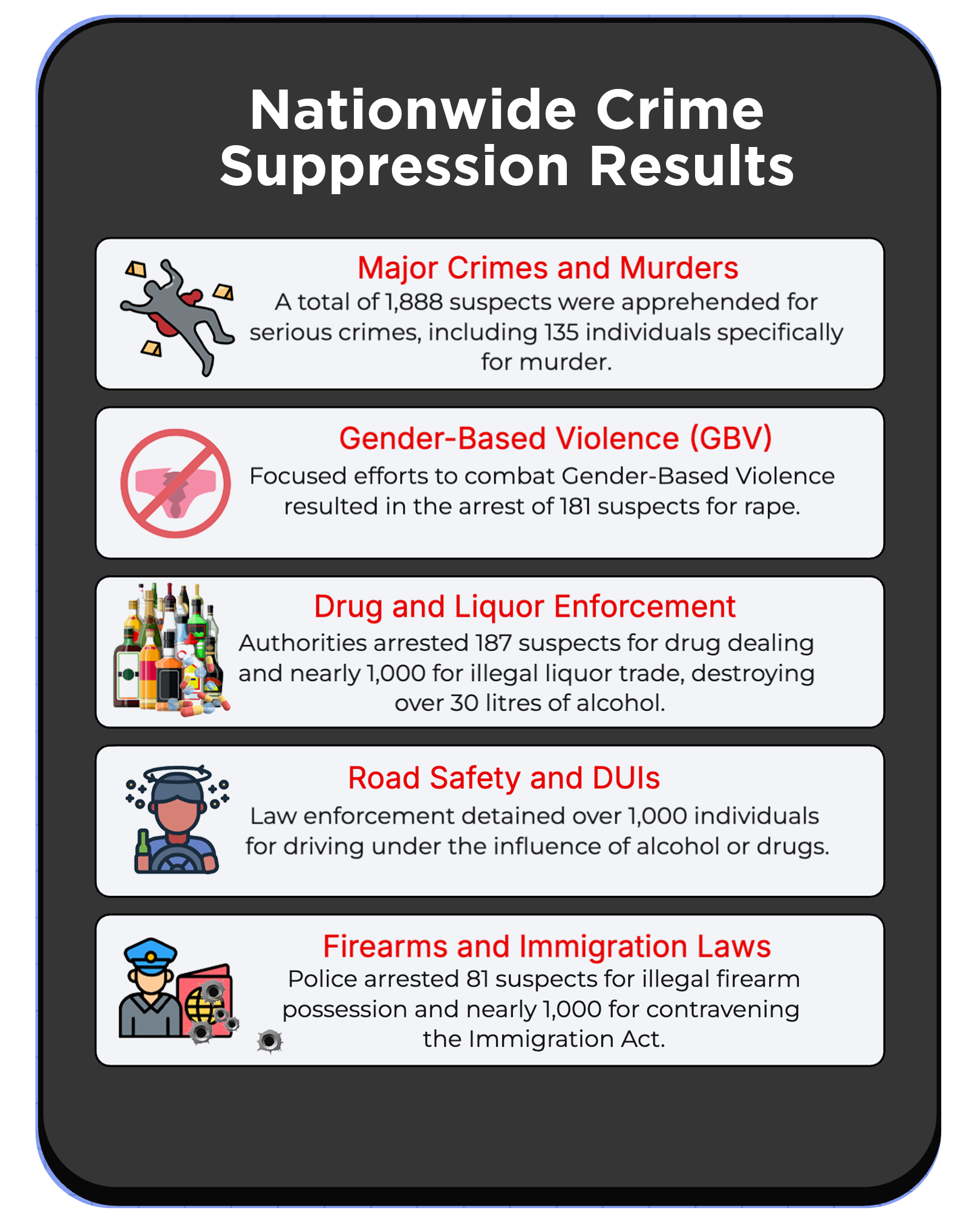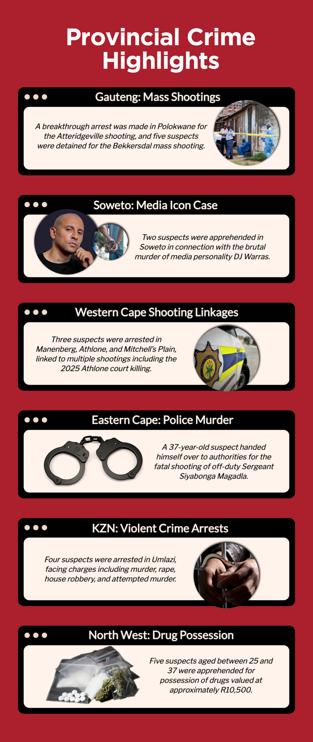 At least 16 000 suspects were arrested for various crimes, including murder, illicit use of alcohol, driving under the influence, and illegal mining activities across South Africa.