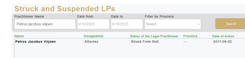 He also warned that anyone using Viljoen’s services is not afforded any of the protections mandated by law. Specifically, they have no recourse to the Legal Practitioners’ Fidelity Fund, which protects client monies from theft, and he is not subject to the LPC’s Code of Conduct or regulatory oversight.