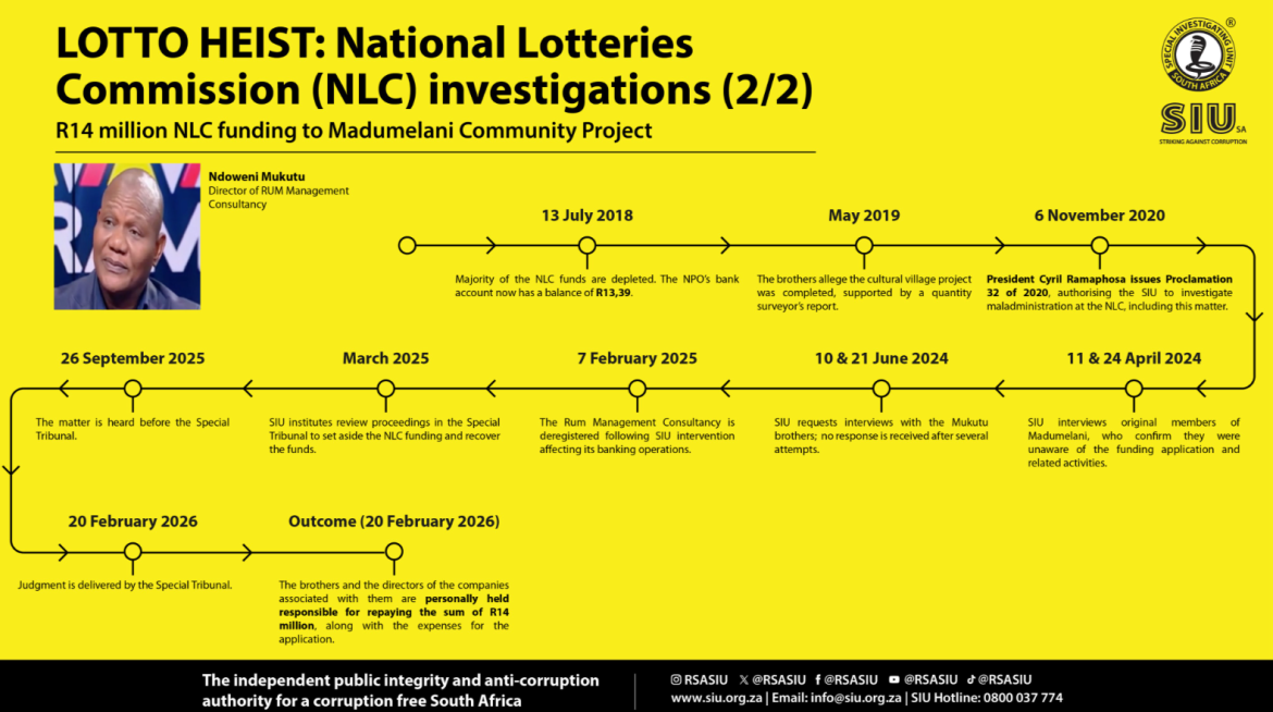 - South Africa’s Special Tribunal has declared a R14m National Lotteries Commission (NLC) grant unlawful, ordering its immediate repayment.