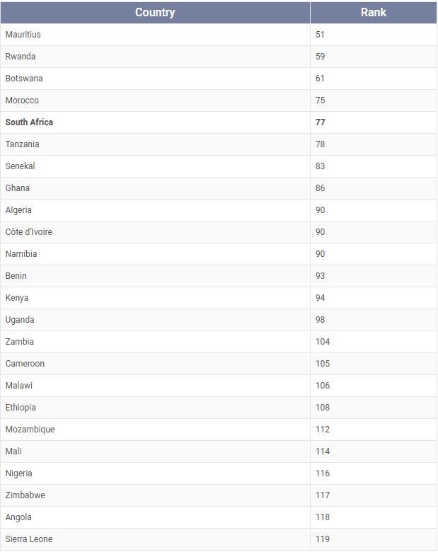 “SA’s global ranking has slipped from 68th in 2022 [out of 104 countries] to 77th in 2025 [out of 120 countries]. At the same time, SA ranks 5th among African countries on the index, after Mauritius, Botswana, Rwanda and Morocco.