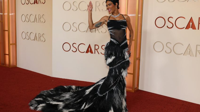 And Teyana Taylor, who has ruled the red carpet all awards season, wore a black and white feathered sleeveless Chanel gown with a sheer panel over her toned stomach.