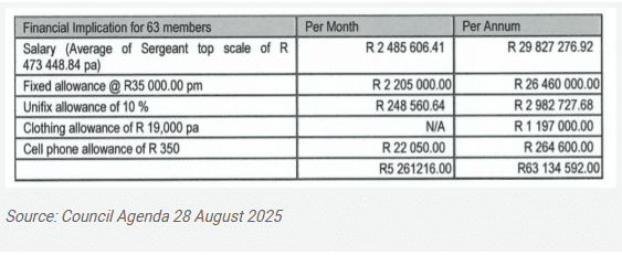 During the special council meeting on 12 September, the council approved a 5% salary increase and cellphone allowances of R3 600 per month for all councillors. This is backdated to 1 July 2024 and still needs to be ratified at provincial level.