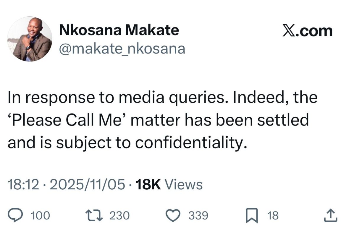 Makate confirmed the settlement on his X account and wrote, “In response to media queries, indeed, the ‘Please Call Me’ matter has been settled and is subject to confidentiality.”