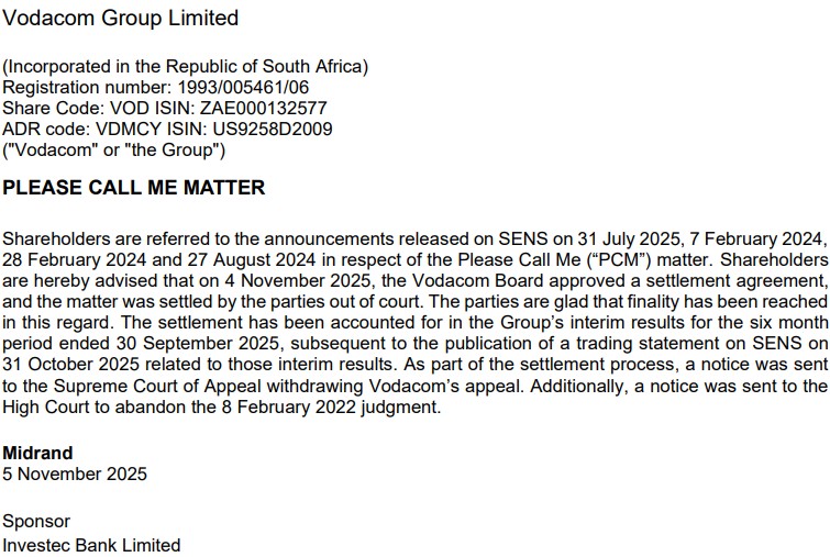 “Shareholders are hereby advised that on 4 November 2025, the Vodacom Board approved a settlement agreement, and the matter was settled by the parties out of court. The parties are glad that finality has been reached in this regard,” the statement reads.