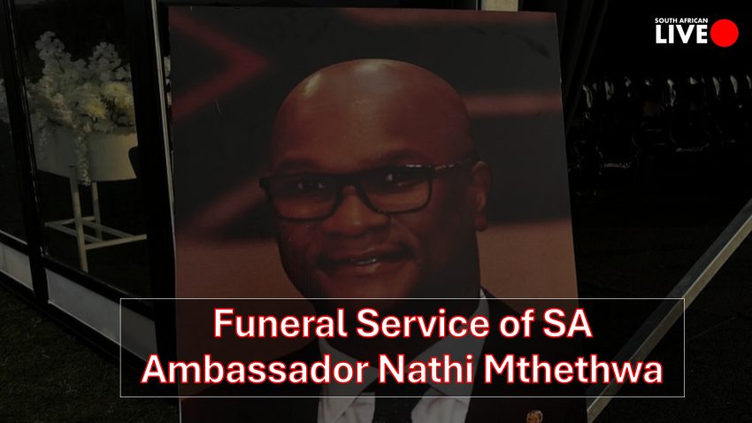 The live broadcast of the funeral service for former Police Minister and South African Ambassador to France, Nathi Mthethwa. He was found dead in a Paris hotel’s inner courtyard after falling from the 22nd floor more than a week ago.