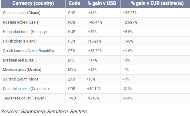 The USD weakened against most emerging market currencies over the past 12 months, but less so against the euro, as the table below shows.