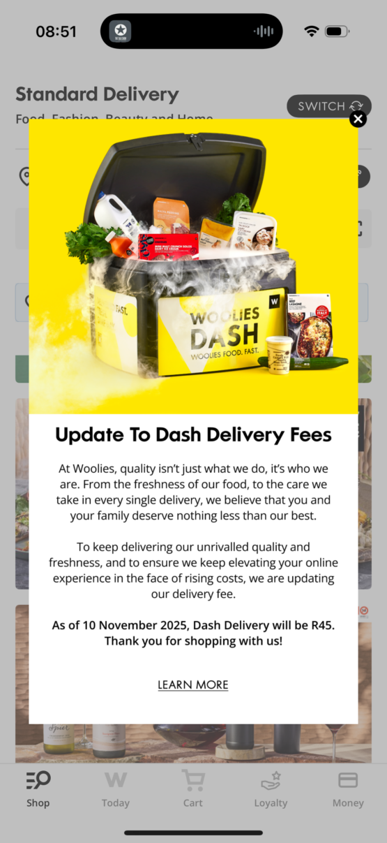 Woolworths has blinked and will hike the delivery fee for its Woolies Dash on-demand service to R45 from 10 November.